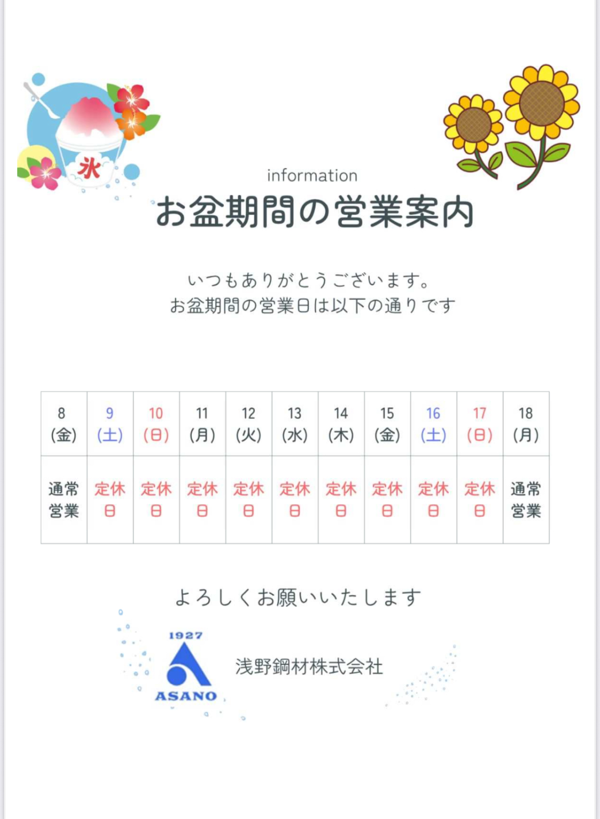 お知らせ お盆休みのお知らせ 2025.08.04 こんにちは! 浅野鋼材です☺ お盆の営業カレンダーを掲載致します。 8/9(土)~8/17(日)までの9連休です👍 長い休みとなりますが、宜しくお願い致します。 Post シェア 納品書電子化のご案内 年末年始の営業案内です