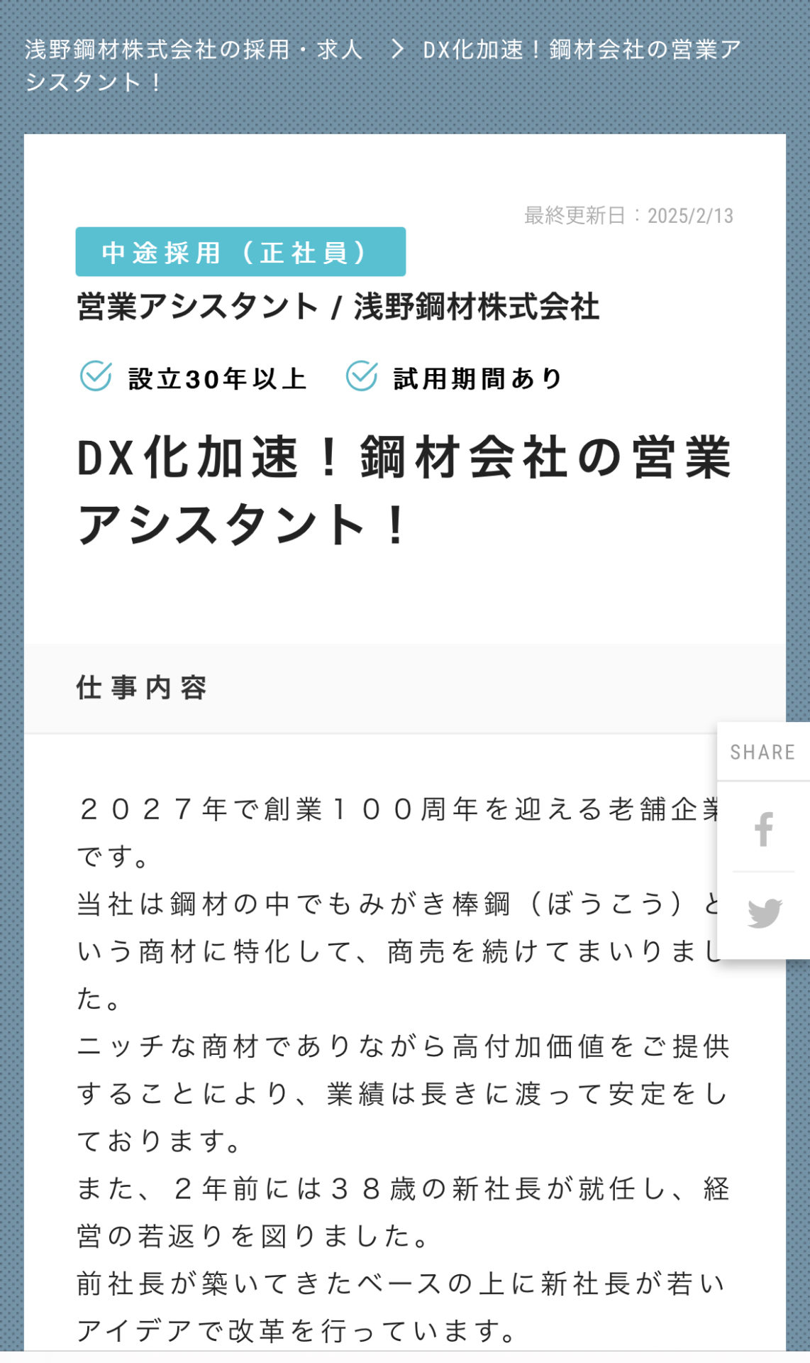 お知らせ スタッフ募集のご案内 2025.02.14 こんにちは。 浅野鋼材です! 当社では新しいスタッフを募集しております。 詳細は、下記URLからご確認下さい♪ 浅野鋼材株式会社の採用・求人情報-engage Post シェア 2月営業カレンダー 3月営業カレンダー