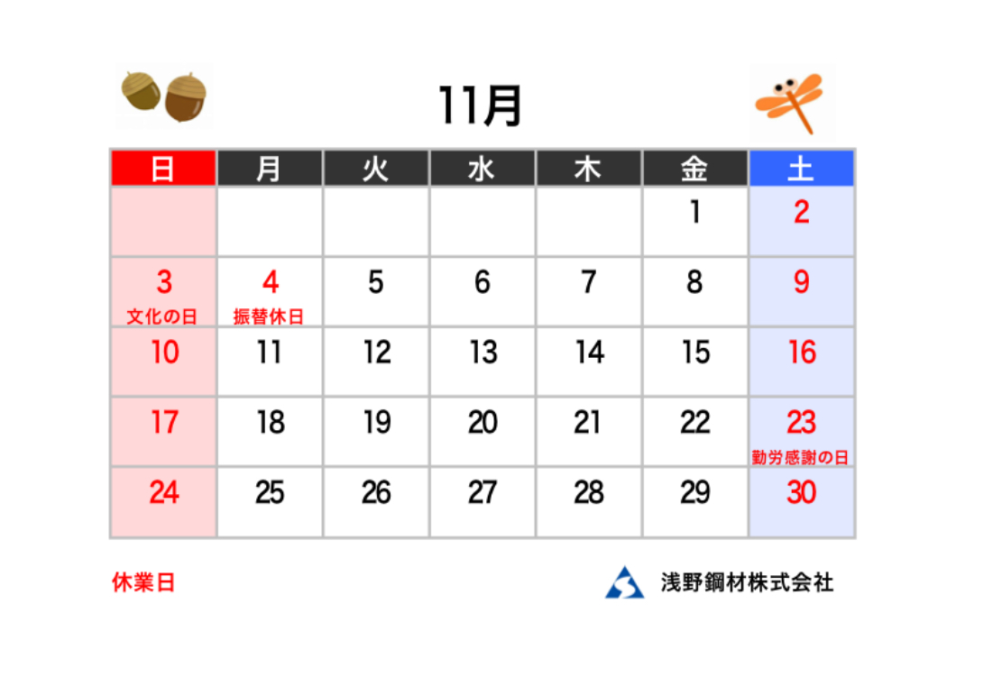 お知らせ 11月営業カレンダー 2024.10.23 こんにちは! 浅野鋼材です☺ 11月の営業カレンダーを掲載します☆ 宜しくお願いします(^^)/ Post シェア 10月営業カレンダー 新しいロゴマークを作成しました!
