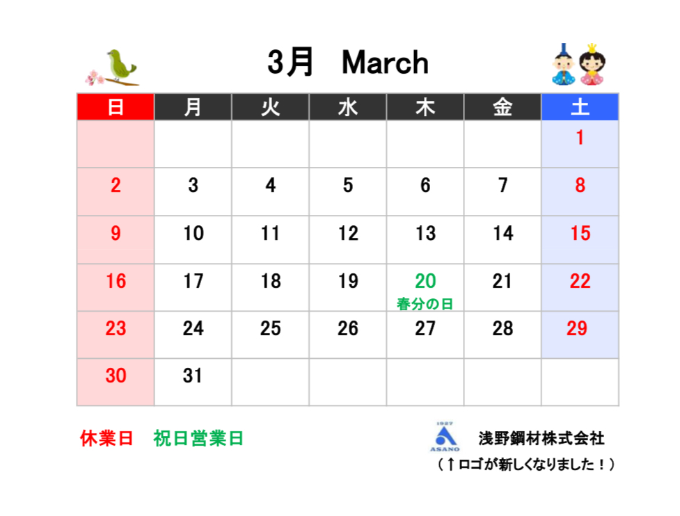お知らせ 3月営業カレンダー 2025.02.21 こんにちは。 浅野鋼材です☆ 3月の営業カレンダーを掲載します。 20日営業+祝日営業1日です。 来月も宜しくお願い致します。(^^)/ Post シェア スタッフ募集のご案内 4月営業カレンダー